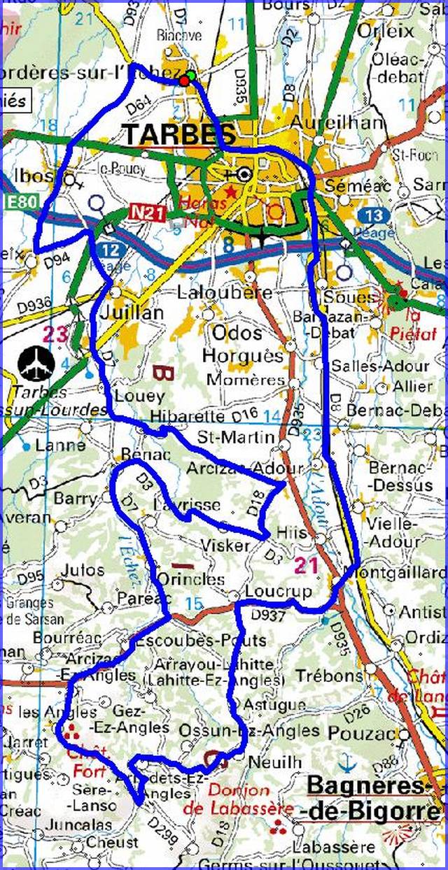 | Bordères,Tarbes,Soues,Biscuiterie Védère,TaD,Montgaillard,Loucrup,Astugue,Neuilh, Col de Lingous,Arcizac-ez-Angles,Bas de Loucrup,Orincles,Bénac,Visker,Arcizac-Adour, Bastourrat,Hibarette,Louey,Juillan, Crématorium, Azereix, Ibos, Bois du Commandeur, Bordères. |