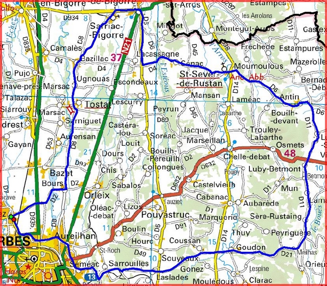 Bordères, Bours, Tostat, Bazillac, Sarriac-Bigorre, Rabastens, TaD, D5, Sénac, St Sever de Rustan, Antin, TaD, D11, Luby-Betmont, Sère-Rustaing, Meilhas, Goudon, Laslades, Séméac, Tarbes, Bordères. |