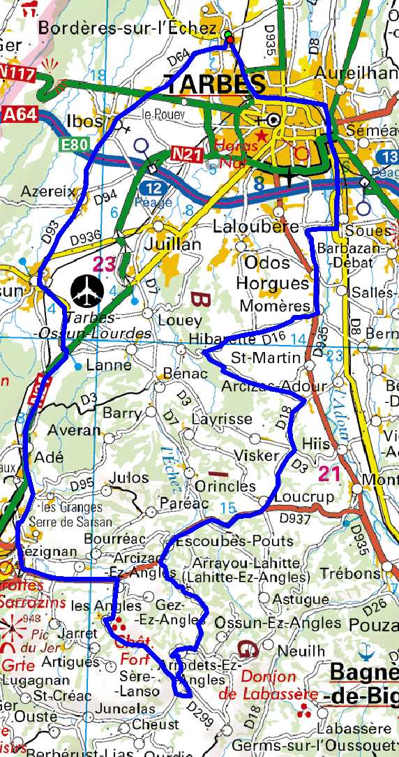 | Bordères, Ibos, Azereix, Ossun, D16,Adé, TaG Crois. N21-Route de Julos, Sarsan, Boulevard du Centenaire,D937, Arcizac ez Angle, TaD Crois. D937-D7, Les Angles, TaG Crois. D7-D26, Arrodets ez Angles, Lahitte ez Angles, Tad Crois. D89-D937, Escoubès-Pouts, Loucrup, D18, TaG Crois. D18-D86, Bastourra, TaD Crois D 86-D16, Momères, Horgues, D92, Soues, Tarbes, Bordères. |