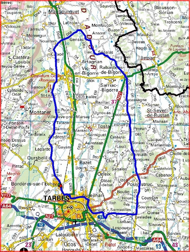 Bordères, Aureilhan, Séméac, Sarrouilles, Laslades, Pouyastruc, Soréac, Rabastens, Ségalas, Liac, Gensac, Lafitole, Nouilhan, Vic, St-Lézer, Siarrouy, Lagarde, Oursbelille, Bordères. |