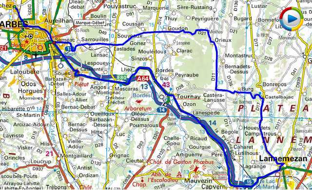 | Bordères, Séméac, Sarrouilles, Laslades, Goudon, TaD crois. D21-D521, Orieux, D11, TaG crois. D11-D17, Houeydets, Lannemezan, Point Café , prendre D817 direction Capvern, Lanespède, Ozon, Tournay, Piétat, Tarbes, Bordères. |