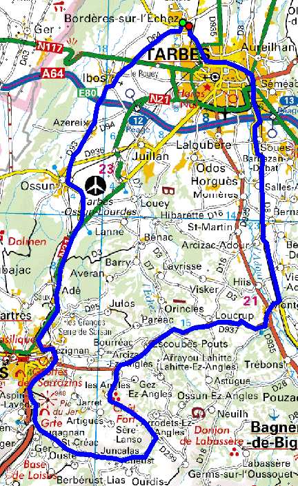 | Bordères , Ibos,Ossun ,Prendre D16, Adé, Lourdes ,Lugagnan, Juncalas, Col du Lingous (575m ),Arcizac ez Angles ,TaD, D937, Loucrup, Montgaillard, Bernac-Debat ,Soues ,Bordères . |