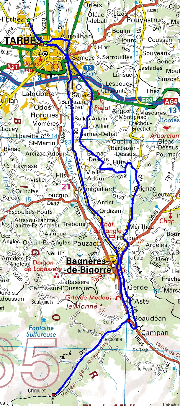 Bordères, Aureilhan, Séméac, Barbazan-Debat, Allier, Bernac-Debat, Bernac-Dessus, Hitte, Orignac, Haut de la Cote, Bagnères, Gerde, Asté, Campan, Lesponne, le Chiroulet, Lesponne, Beaudéan, Bagnères, Ordizan, Soues, Bordères. |