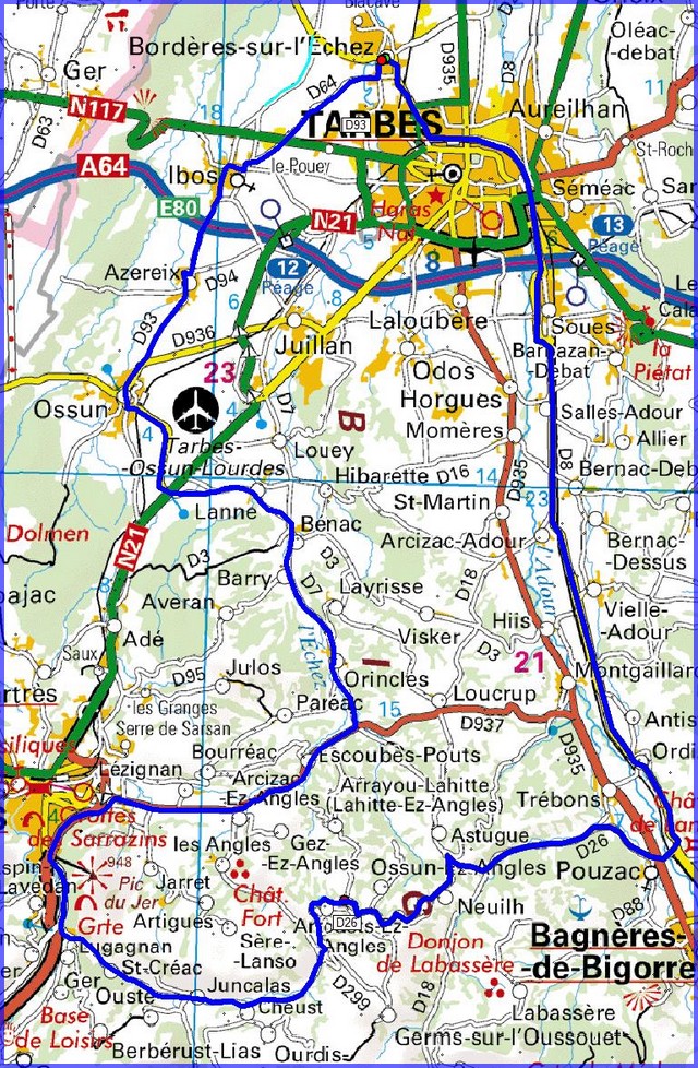 | Bordères, Soues, Ordizan, Pouzac, Neuilh , Juncalas, Lugagnan, Lourdes, Arcizac ez Angles, Bas de Loucrup, Bénac, Lanne, Ossun, Ibos, Bordères |