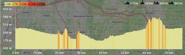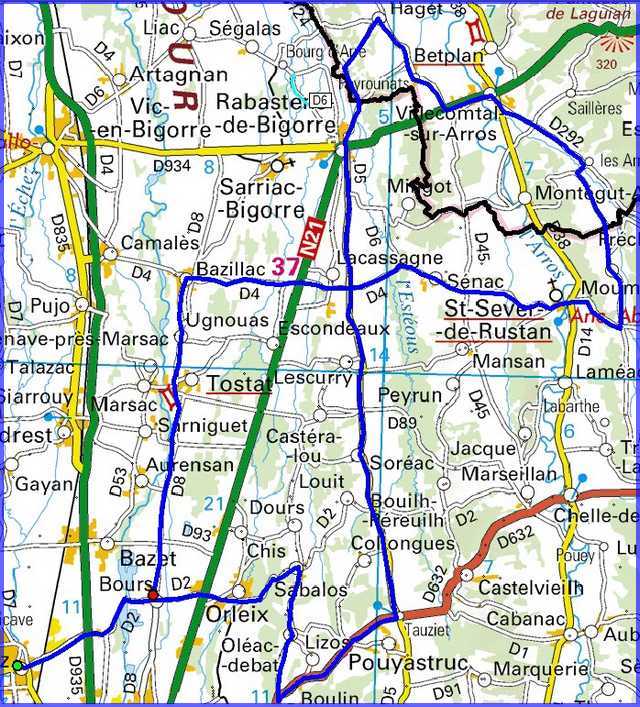 | Bordères, Bours, Tostat, Bazillac, Lacassagne, Sénac, Saint-Sever de Rustan, TaG croisement D6-D606,, Moumoulous, Villecomtal sur Arros, Haget, Rabastens, Soréac, TaD croisement D5-D632, Pouyastruc Boulin, Oléac-Debat, Sabalos, Orleix, Bours, Bordères. |