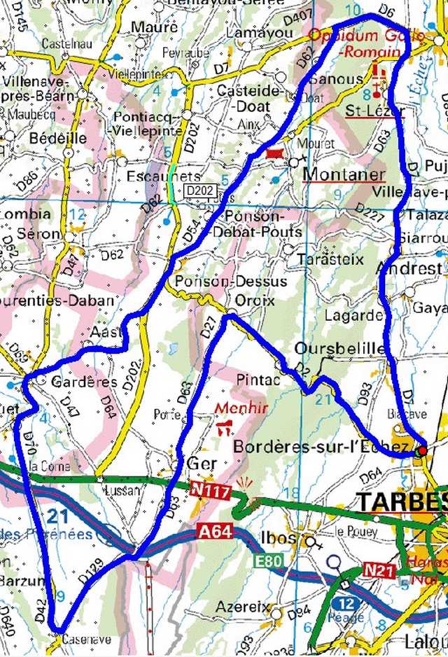 | Bordères, Bois du Commandeur, Pintac, Oroix, Ger, haut de Pontacq, Luquet, Gardères, Aast, Ponson-Dessus, Ponson-Debat-Pouts, Sanous, Vic, Saint-Lézer, Oursbelille, Bordères. |