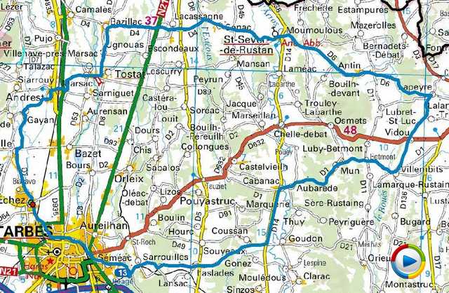 | Bordères, Aureilhan,Séméac, Sarrouilles, Laslades, TaG crois. D21-D14, TaD crois. D14-D1, Cabanac, Aubarède, Mun, Villembits, Vidou, Lapeyre, D6, Antin, St-Sever de Rustan, Sénac, Lacassagne, Bazillac, TaG, Ugnouas, Tostat, Marsac, Andrest, Gayan, Oursbelille, Bordères. |