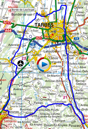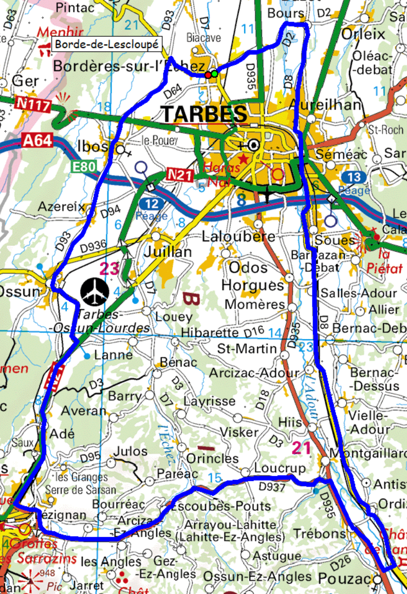 Bordères, Ibos, Azereix, Ossun, Prendre D16, TaD crois.D16-RN21, Lourdes; Arcizac ez Angles, Escoubès-Pouts, Loucrup, Trébons, TaG D935, Pouzac, Ordizan, Bernac-Debat, Salles-Adour, Soues, Aureilhan, Bours, Bordères.