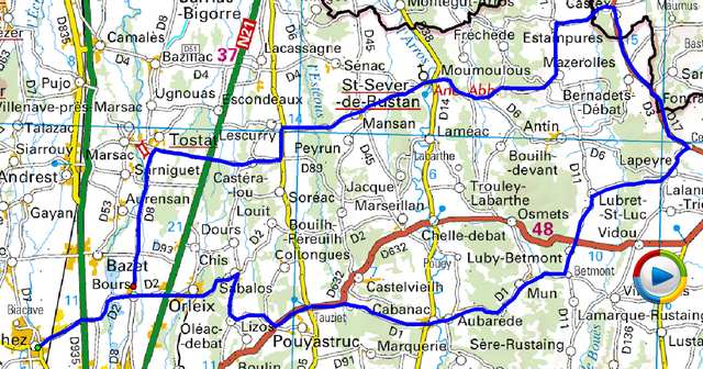 | Bordères, Bours, Tostat, Castéra-Lou, D119, D5, Mansan, D27, St Sever de Rustan, Mazerolles, Estampures, Castex, D17, Lapeyre, D611, Lubret-St-Luc, Luby-Betmont, D1, Aubarède, Cabanac, D1, Oléac-Debat, Sabalos, Orleix, Bours, Bordères |