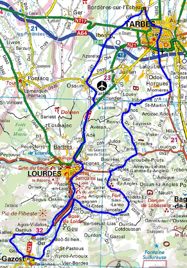 | Bordères, Ibos, D93, Azereix, Ossun, D16, Adé, N21, Lourdes, Pont-Neuf, Agos-Vidalos, TaD, Ouzous, D102, Salles, Sére-en-Lavedan, D102, Gez, Argelès-Gazost, Silhen, Boô-Silhen, D13, Ger, D26, St Créac, D7, Les Angles, Arcizac-ez-Angles, Escoubès-Pouts, Orincles, Bénac, Hibarette, Momères, Horgues, Laloubère, Tarbes, Bordères |