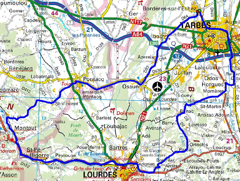 | Bordères,Soues, Salles-Adour, Horgues, Momères, Hibarette, Bénac, Orincles, Paréac, Bourréac, Lourdes, Peyrouse, St-Pé de Bigorre, Lestelle, St Vincent, Pontacq, Ossun, Azereix, Ibos, Bordères |