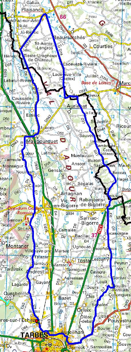 | Bordères, Oursbelille, Siarrouy, Talazac, St Lézer, Vic en Bigorre, Larreule, TaD crois. D7-D943, Maubourguet, TaG crois. D943-D8, Labatut-Rivière, D173, TaD crois. D173-D373, Belloc, Plaisance, TaD crois. D373-D14, Ladevèze-Rivière, TaG crois. D14-D943, TaD crois. D943-D31, Buzon, Beccas, Haget, TaD crois. D31-D280, Rabastens, prendre D5, Soréac, Bouilh-Péreuilh, TaD crois. D5-D2, Louit, Sabalos, TaD crois. D2-D119, Oléac-Debat, TaD crois. D119-D 632, Boulin, Aureilhan, Bordères. |