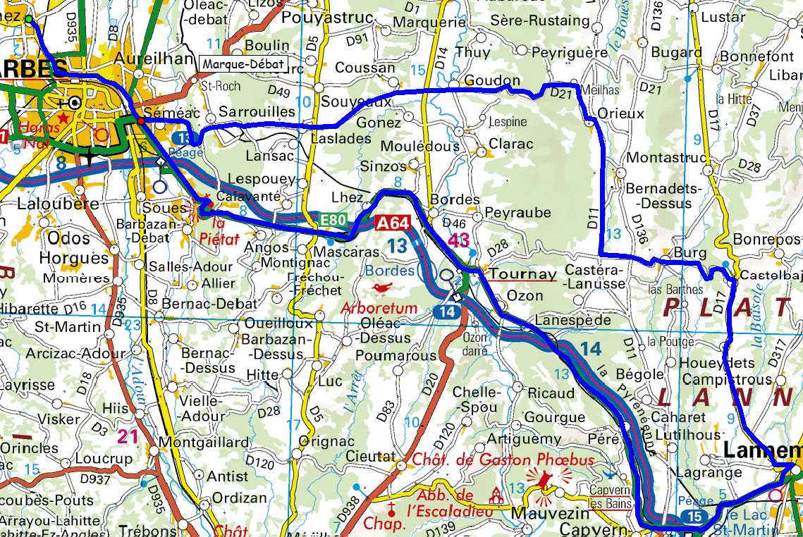 | Bordères, Séméac, Sarrouilles, Laslades, Goudon, TaD crois. D21-D521, Orieux, D11, TaG crois. D11-D17, Houeydets, Lannemezan, Point Café , prendre D817 direction Capvern, Lanespède, Ozon, Tournay, Piétat, Tarbes, Bordères. |