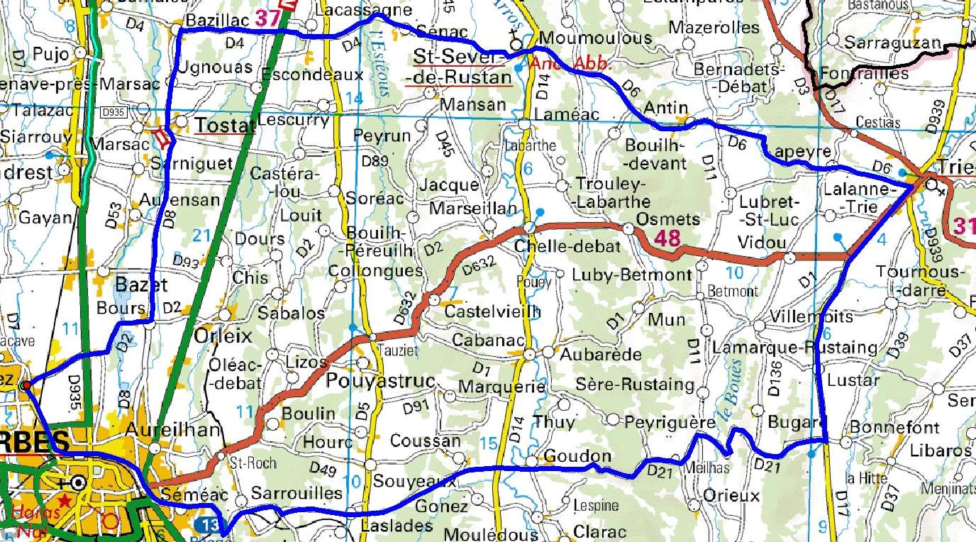 Bordères, Bout du Pont, Séméac, Laslades, Goudon, Bonnefont, Lustar, Trie su Baïse, Lapeyre, Antin, Saint-Sever de Rustan, Sénac, Lacassagne, Bazillac, Tostat, Bours, Bordères |