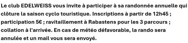Samedi 25 Octobre:Randonnée cyclotouriste organisée par Edelweiss Cyclotourisme Tarbes |