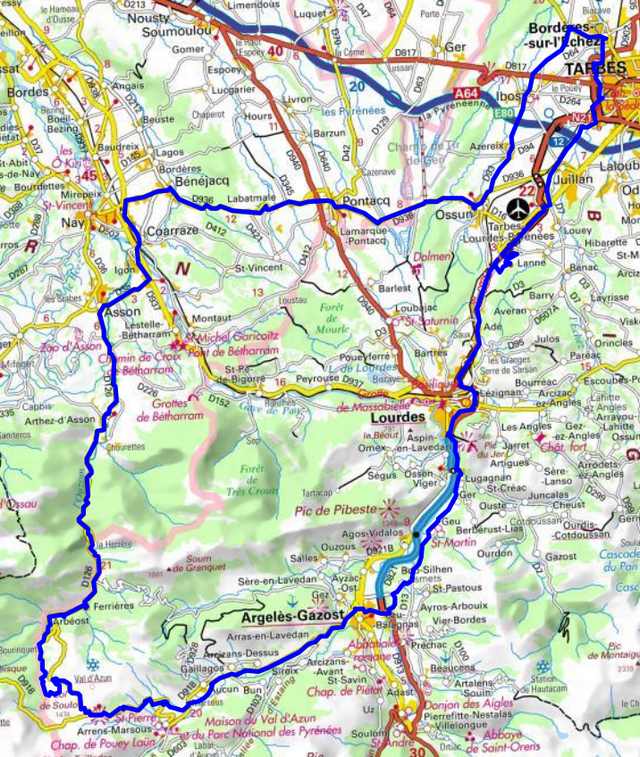 | Bordères, Ibos, Azereix, Ossun, Pontacq, Bénéjacq, Coarraze, D937, Igon, D35, Asson, D126, Arthez-d’Asson, D126, Ferrières, Arbéost, Col du Soulor, D918, Argelès-Gazost, Lourdes, Adé, Juillan, Bordères, |