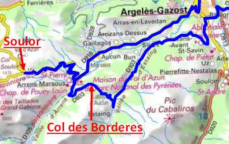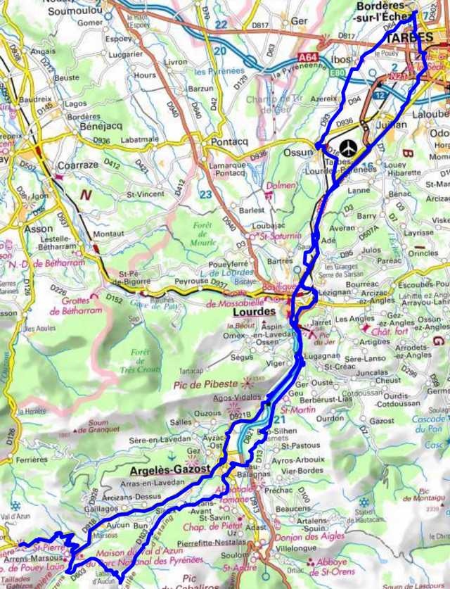 | Bordères,Ibos, Azereix, Ossun, Adé, Lourdes, Pont Neuf, Agos-Vidalos, Argelès-Gazost , Arras en Lavedan, Aucun, Arrens-Marsous, Col du Soulor, Arrens-Marsous, arrêt point d’eau, Col des Bordères, Estaing, Arcizans-Avant, Saint Savin, Lau-Balagnas, Ayros Arbouix, Boô-Silhen, Ger, Lugagnan, Lourdes, Adé, Juillan, Bordères |