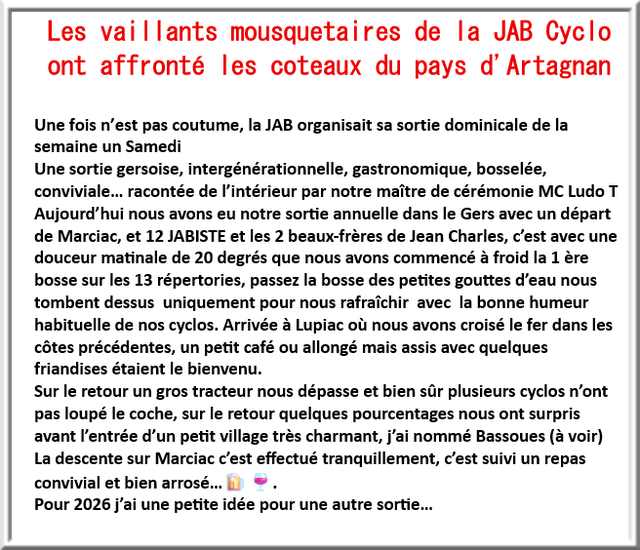 La JAB Cyclo est affilié a la F.F. Vélo, et compte 44 adhérents pour l'année 2025 et une