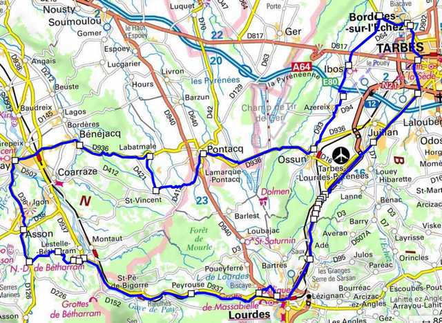 | Bordères, Bois du Commandeur, Ibos, Ossun, Pontacq, St-Vincent, Bénéjacq, Nay, D126, Route du Calvaire, Lestelle-Bétharram, D937, St Pé de Bigorre, Peyrouse,Lourdes, Adé, Juillan, Bordères |