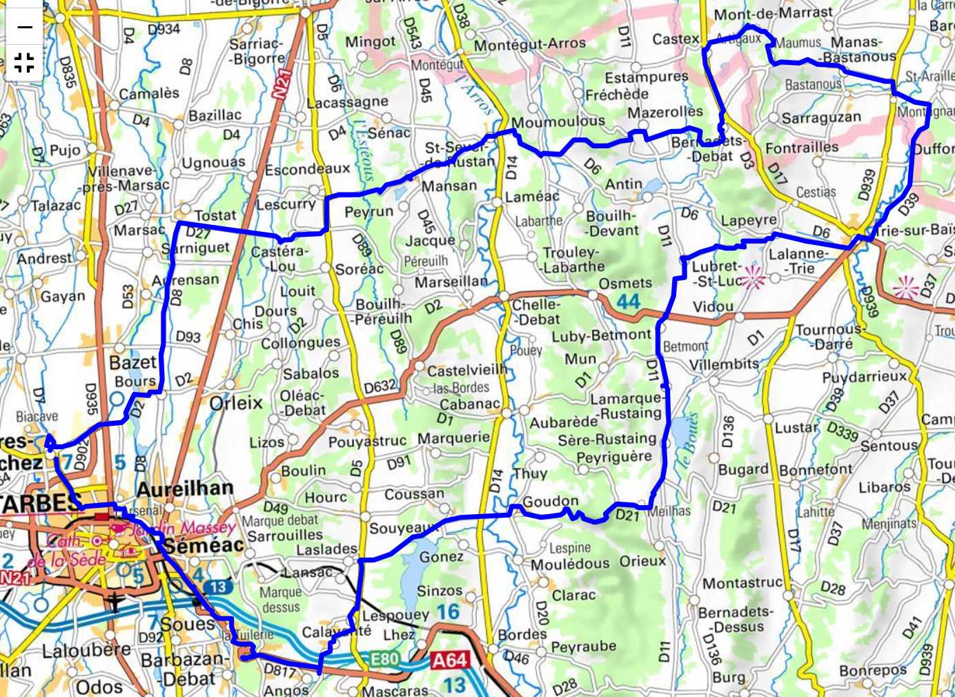 | Bordères, Bours, D8, Tostat, D27, D119, Castéra-Lou, D27, Mansan, 27, St Sever de Rustan, Mazerolles, Bernadets-Debat, Castex, D567, Manas-Bastanous, Trie sur Baïse, Lapeyre, D611, Lubret-St-Luc, Luby-Betmont, Lamarque-Rustaing, Sère-Rustaing, Goudon, D21, Lespouey, Calavanté, Séméac,Bordères |