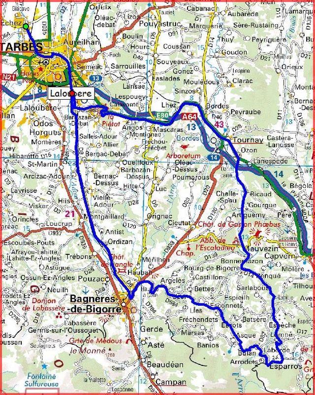 | Bordères ,Soues, Piétat ,Tournay ,Ozon, TaD,D14, Ricaud ,Bonnemazon, Bourg de Bigorre Esparros,D26 , Laborde ,Bulan, Pont d' Esqueda, Uzer ,Haut de la cote Bagnères ,Tarbes ,Bordères. |
