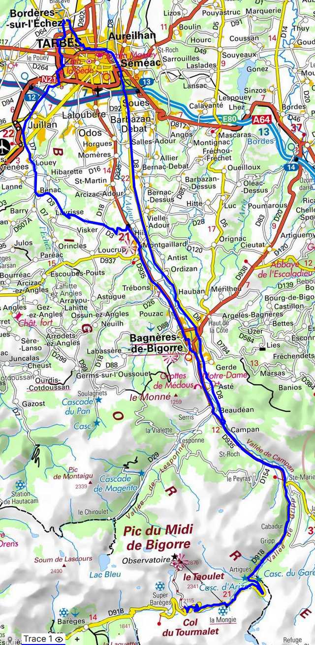 Bordères, Bout du pont, Soues,Montgaillard, Bagnères, Asté, Campan, Tourmalet, Bagnères, Montgaillard,D3, Visker, Bénac, Juillan, Bordères