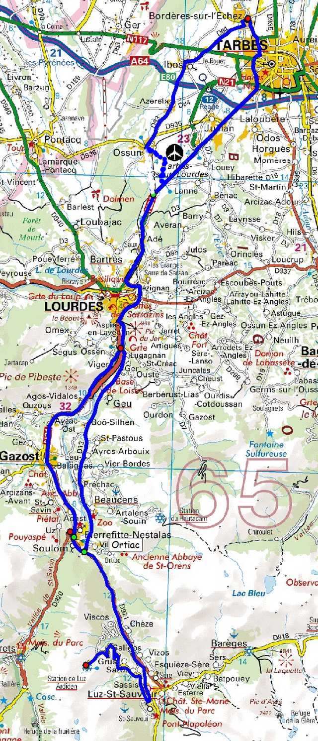 Bordères, Ibos, Azereix, Ossun, Prendre D16, TaD croisement D16-RN21, Adé, Lourdes, Argelès-Gazost, Pierrefitte-Nestalas, Sassis, Saint-Sauveur les Bains, TaD prendre D12 , Sazos, Grust , Station de sport d'hiver de Luz-Ardiden, Sazos, Grust, Saint-Sauveur les Bains, Sassis, Villelongue, Préchac, Boô-Silhen, Lugagnan, Lourdes ,Adé, Juil lan, Tarbes, Bordères. |